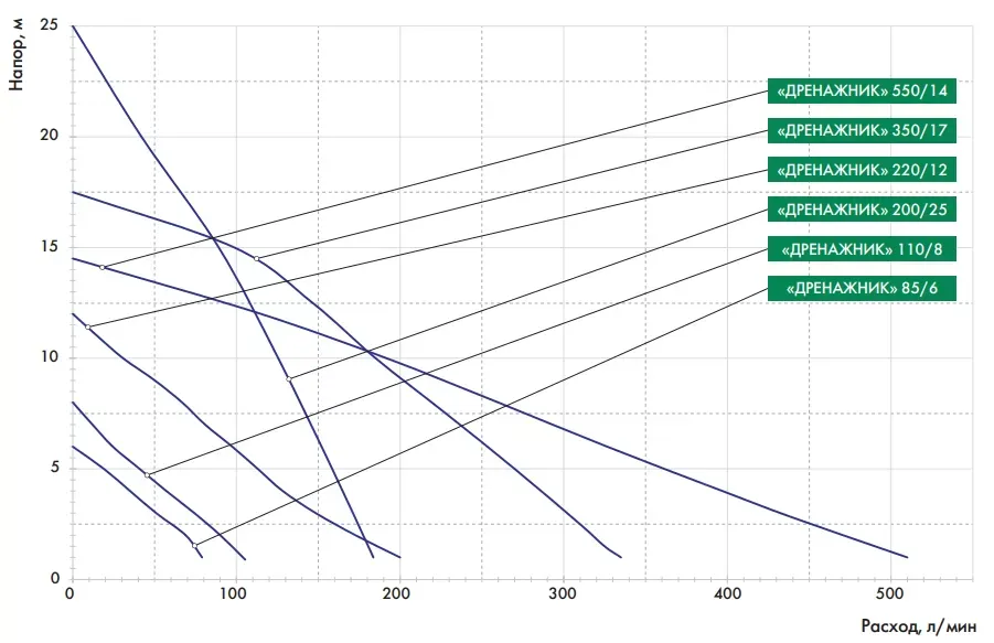 Графические характеристики дренажного насоса ДЖИЛЕКС ДРЕНАЖНИК 110/8