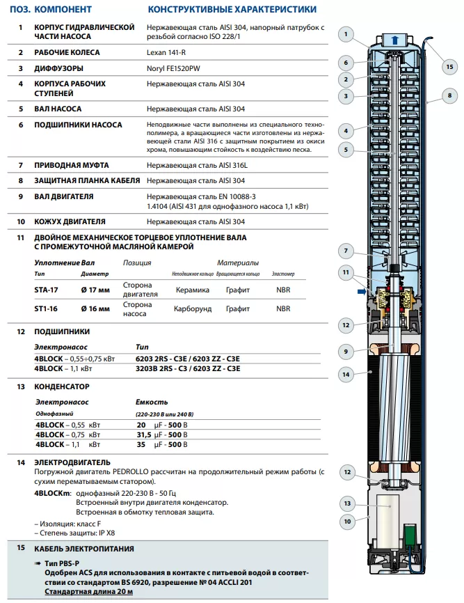 - Электродвигатель — погружной двигатель PEDROLLO рассчитан на продолжительный режим работы (с сухим перематываемым статором). 4BLOCKm: однофазный 220-230 В - 50 Гц Встроенный внутри двигателя конденсатор. Встроенная в обмотку тепловая защита. – Изоляция: класс F – Степень защиты: IP X8